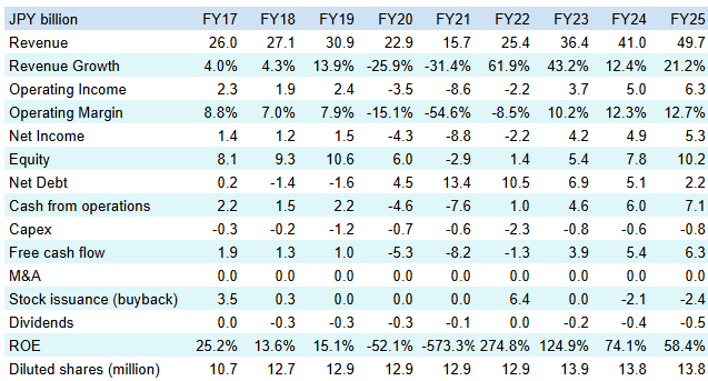 Management also has ambitious targets, and aims for JPY80bn in revenue by 2030, compared to ca JPY50bn currently; and ca JPY10bn in operating profit, compared to ca JPY6.3bn currently. To get there, management wants to (i) operate ca 150 hotels, thereby further increasing economies of scale; (ii) shift the portfolio towards a more premium mix, to increase Average Daily Rates; and (iii) increase direct bookings, thereby reducing commission fees paid to online travel agencies like Expedia or Booking.com. Given the company’s track record over the past decade, these targets do not seem unrealistic - in typical Japanese style, management tends to provide conservative guidance and then over-deliver during normal times.